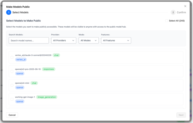 Admin can select models to expose on public model hub -> Users can go to the public url (/ui/model_hub_table
